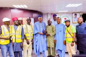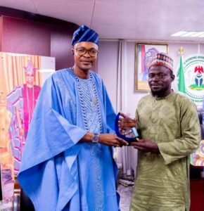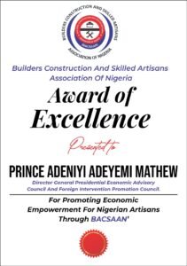 Flowerbudnews reports that Prince Mathew was formally bestowed – AWARD FOR EXCELLENCE For Promoting Economic Empowerment for Nigerian Artisans through BACSAAN – at a ceremony held in his office during a courtesy visit by the leadership of BACSAAN led by its National President, Alhaji Fasasi Mohammed Jamiu.