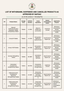 This is to inform the General Public that the following products are approved for withdrawal, suspension and cancellation by NAFDAC.