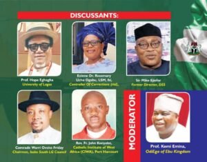 ”Discussants who have already confirmed their physical presence include former DSS Director and security expert, Sir Mike Ejiofor; Prof. Hope Eghagha of the University of Lagos; Lady Rosemary Ogabu, a retired Controller of Corrections; the Chairman of Isoko South Local Government Council, Hon. Warri Ovoke; and Rev. Fr. John Konyeke of the Catholic Institute of West Africa (CIWA).