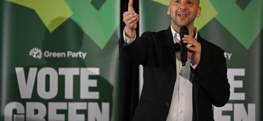 –  Green Party leader Zack Polanski speaks during the launch of the local election campaign in London, England.