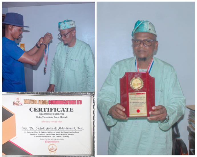 The Rector of Federal Polytechnic Ayede, Engr. Dr. Taofeek Adekunle Abdul-Hameed (FNSE), has been honoured with the prestigious Leadership Excellence and Education Icon